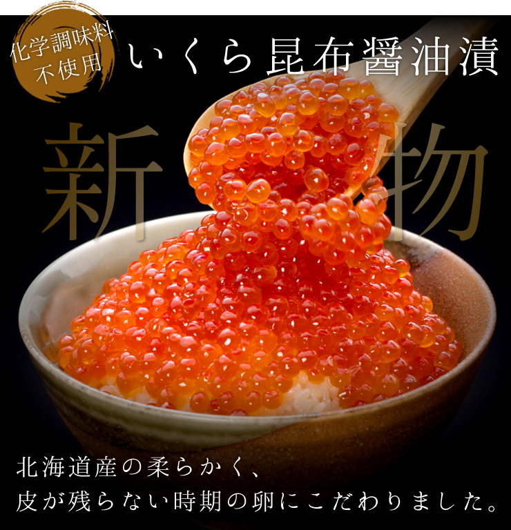 一度食べると他のいくらは、食べることができないとおっしゃっていただく方も多い逸品。 その理由は、北海道で朝水揚げされた新鮮な秋鮭の卵と、こだわりの昆布醤油、 特定銘柄の上撰清酒だけで漬け込んだ、シンプルな作り方にあります。 鮮度が良いので生臭さがまったくなく、また昆布醤油と清酒で旨味を引き出した やさしくまろやかな味わいは、ご年配の方からお子様まで、 安心してお召し上がりいただけるいくらです。 |