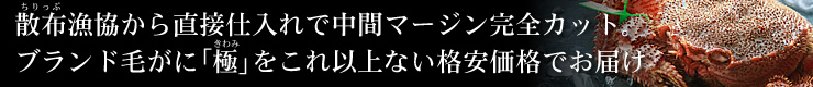 毛がには、1年を通して、北海道近海のいたるところで漁が行われています。 今時期の毛がには、身がギュッと詰まって、 そしてこの度お届けする散布のブランド毛がに「極」は 昨日まで泳いでいた毛がにが、 |