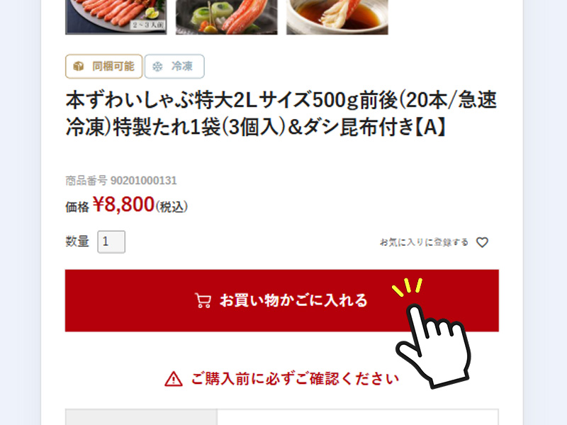 欲しい商品が見つかったら、「ご注文はこちら」をタップし、「お買い物かご」に入れます。 |